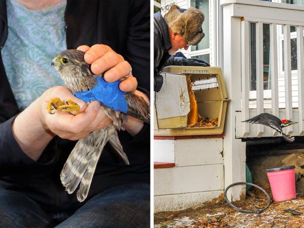 OFES takes in about 50 injured birds a year for rehabilitation. OFES specializes in the rehabilitation of raptors, like the female American Kestrel (above left), that was fished out of a stream with a wing injury. It’s not uncommon, however to find other types of birds in their rehabilitation space, like the Pileated Woodpecker returning home (above right)!