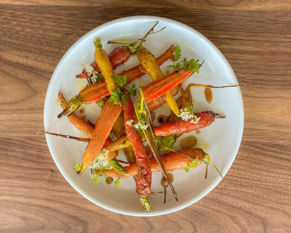 1. Carefully wash the carrots, making sure to get any grit that may have accumulated at the top of the carrot, just at the base of the greens. Toss the carrots with the olive oil to coat evenly. Season with salt and transfer onto a roasting rack on a sheet tray. Roast the carrots in an oven at 450°F for 12–15 minutes; you want the carrots to take on a little roasting color, but still have a little bit of a bite. Remove carrots and allow to cool.
