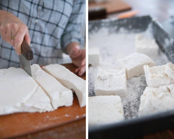 7. When set, remove the marshmallows by lifting from the parchment paper flaps.