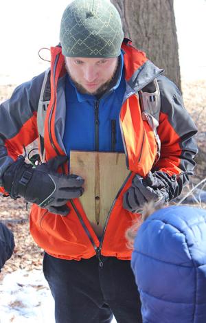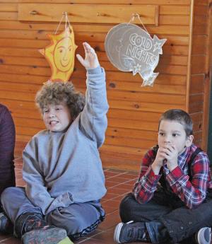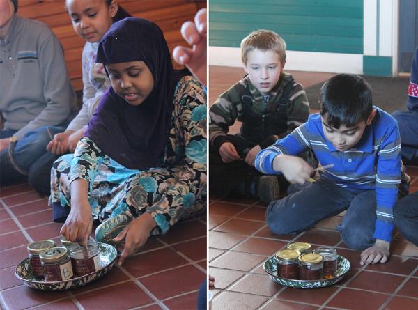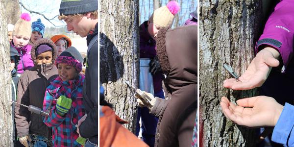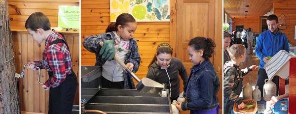 10:10 | Shelburne Farms educator Justin Frawley warms up his group with a question that puts students squarely at the helm of this inquiry ship. “What do you know about maple syrup and what do you like to eat with it?” “My name is Colin and what I like with maple syrup is cauliflower, broccoli, and waffles. It’s really good!” I must admit, I wasn’t expecting vegetables to make the list. But of course, it makes sense. Maple syrup is a great complement to savory foods, in addition to its primo role as a topping to pancakes and waffles! 10:30 | The students do a blind taste test of four different syrupy sweeteners: honey, agave nectar, table syrup (think “Log Cabin”), and maple syrup from the Farm. They’re pretty good maple experts already because they have little trouble identifying the real stuff. “That’s maple syrup. Totally. Maple syrup.” Justin asks, "How many ingredients do honey, agave nectar, and maple syrup have?" The answer? One each. How many in table syrup? Ten. (You can see an ingredient list for one popular store brand here). 10:45 | What does it take to make maple syrup? Students answer that by playing a "K.I.M. (‘Keep in Mind’) Game": the tools needed for sugaring are laid out on a blanket, then covered with a sheet. Students lift the sheet briefly, scan the blanket, then generate a list of the tools they saw. Wood, sun, drill, tap, scoop, a card saying 219°F (the boiling point of sap), a thermometer... They don’t miss much! Justin explains how cool nights and warm days are needed to create pressure in the tree, which helps push the sap from the roots up to the branches. 11:00 | It's time for a break to get outdoors! The farmyard isn’t a normal stop on our sugaring field trip, but the school made a special request for a visit, so off we go. You can’t argue with the joy of finding fresh eggs or the excitement of "I'M HOLDING A CHICKEN!!!!" 11:30 | Back in the education center, after an orientation from Justin, students explore various sugaring stations. The room erupts in a flurry of maple entrepreneurship!Some students drill into a real tree trunk to practice tapping. Others don flannel and gloves to boil sap at the evaporator. In this case, the sap is just tap water, but with these indoor explorations, students are getting prepared for what they’ll see in the real sugaring operation outdoors. Sales are brisk at the Maple Farm Stand station, where students “sell” the syrup they’ve bottled. Some tough bargaining goes on, too.