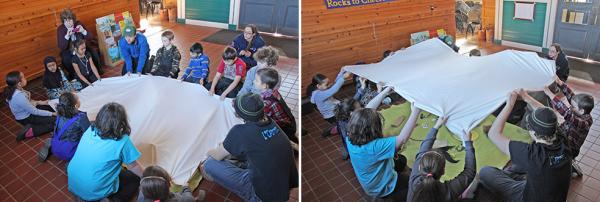 9:20 | In the McClure Education Center in the Farm Barn, our educators review logistics: how many groups; who will lead each one; where each group will go and when. It’s an impressive bit of choreography. While waiting for the bus, apprentice Kelly Taylor also finds a brief moment for yoga to help get focused for the day.9:45 | The bus arrives a little late and it’s a big group – 60 students, so our educators quickly move them into a brief snack, an intro, and into their small groups.