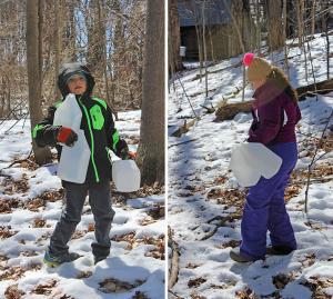 12:30 | After lunch it’s off to the sugarbush! Full disclosure: it was too cold to sugar the day of this particular field trip. But that didn’t damper spirits any. And while seeing and smelling boiling sap is a treat, the essential field trip explorations don't depend on it. 12:40 | Is the tree big enough to tap? A tree has to be 44 inches in diameter to support one tap, while maintaining the health of the tree. It’s up to the students to figure out if “their” tree hits that mark. This one does. Where do you put in a tap? On an old maple board, Justin shows how previous taps leave scars in the tree. You have to avoid scarred areas when you insert a new tap. Why? The scar tissue is dead – no sap runs through it. But just like humans, trees recover from small wounds, so with careful tapping, the tree will continue to grow and thrive. Having found a safe spot on the tree to tap, each student gets to contribute to drilling a single new tap hole (sloped slightly down so the sap will flow), then gently tap in the new tap with a hammer (hence the word, "tapping"!). Almost immediately, the sap starts flowing. So do the questions -- and the excitement. “How long will it take all the sap to come out?” “When do we put the bucket under it?” "I've never gone maple sugaring!" 1:00 | The group visits with sugarmaker Lynn Wolfe. She shows how sap comes into a big vat, then is fed through a tube into the evaporator to be boiled into syrup. “It looks like a bathtub!” says one student referring to the vat. “I want to swim in it!” Lynn shares that right now, early in the season, we’ve made 40 gallons of maple syrup. Last year we made a total of 200 gallons. “That’d fill a bunch of bathtubs!” the same girl exclaims. 1:15 | How much sap makes a gallon of syrup? In our last activity of the day, students hunt for empty gallon jugs hidden in the sugarbush to find the answer. Once gathered, there are 38 white jugs in the pile. In our sugarbush, it takes about 38 gallons of sap to make one gallon of syrup. (You’ll often hear a rounded figure of 40:1.) 1:35 | Mmmmmmaple! With a parting taste of maple syrup, the group boards the bus to return to their school. I’m a bit chilly, but I am warmed and inspired by what I've just been part of: the skill of our educators, the engagement of the teacher -- who seamlessly tied the learning back to her classroom work, and above all by the enthusiasm and joy of the students, who will return home a little more connected to their Vermont home and landscape, the pure sweetness on their breakfast table, and the world outside their door.