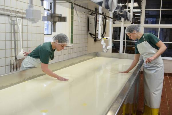 There are several types of rennet. At Shelburne Farms, we utilize traditional calf rennet. Calf rennet contains two enzymes, chymosin and pepsin, in a natural ratio that is suitable for our style of cheese. (Chymosin causes coagulation, pepsin has impacts on the aging process.) This traditional rennet has more reliable results in yield, as well as flavor profile, leading to less defective cheese. It is also a natural and non-GMO option that exemplifies our efforts to be sustainable by utilizing all parts of the animal.