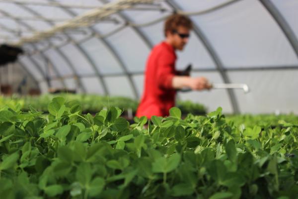 Market Gardener Josh Carter waters starts in the greenhouse (peas in the foreground).