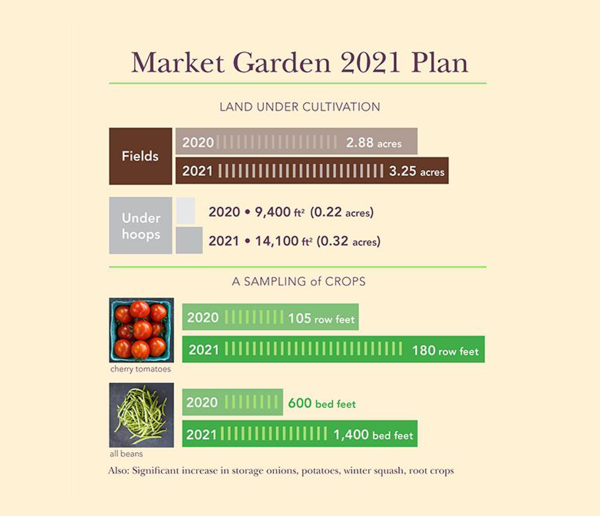 When March 2020 hit and the pandemic closed the doors to the Inn’s beloved dining space, quick changes were made to best reroute the harvest that had been destined for the dining room to be used in retail and packaged foods. Now, with a better sense of the coming year, the Market Garden Team has had the chance to step back and learn from the last twelve months.