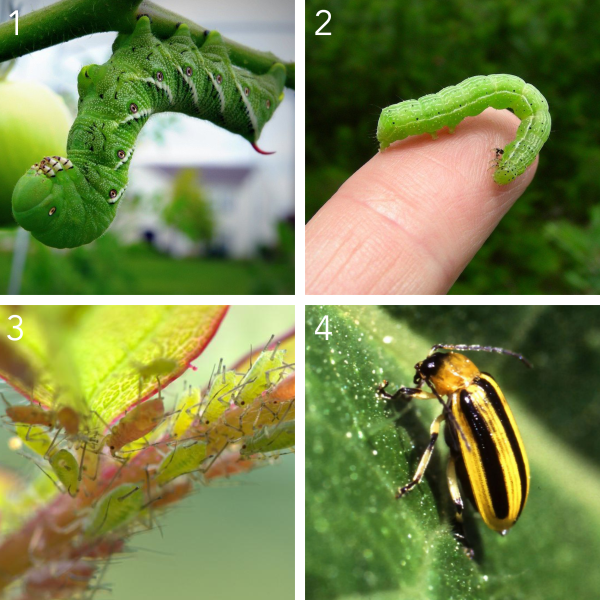 - Tomato Hornworms - Tomato hornworm caterpillars can quickly devour the leaves and fruit of your tomato plants, and despite their size (up to 4 inches long!), they are surprisingly camouflaged against the tomato plant. I look for their large brown droppings and then follow the plant upwards until I find the hornworm and then remove it. If the hornworm is covered in small white cocoons, you can leave it as it has become host to a parasitic wasp that is beneficial to your garden! It is also believed that planting basil, dill, and marigolds alongside your tomatoes can help deter hornworms from moving in. Tomato hornworms turn into the beautiful Five Spotted Hawk Moth - a moth resembling a hummingbird with a 4-6 inch wingspan!! This moth is a pollinator as well as food for bats.