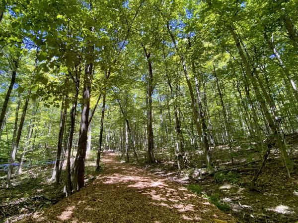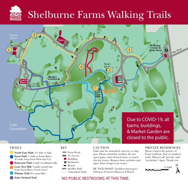 1. Lone Tree Hill. (See map at bottom of blog for numbered locations.) The Farm’s highest point offers great views of the Inn, Lake Champlain, Adirondack Mountains, and Green Mountains. It is the site of The Lone Tree Hill memorial, originally built in memory of Derick V. Webb who donated Shelburne Farms’ land and buildings to the nonprofit in 1984. 2. Sheep's Knoll. Vistas of the Green Mountains to the East (Mount Mansfield is in center of this photo), pastures, woodlands, wildlife, and the Farm Barn are among some of the views from Sheep’s Knoll. The rustic bench here is one of several found along the trail routes. Each is made from rot resistant woods harvested from Shelburne Farms trees: Cedar (benches and backs) and Black Locust and White Oak (pegs). 3. Cows in pasture. Along several paths, you can skirt farmland and pastures where you may see our Brown Swiss dairy herd or flock of sheep grazing. You may even encounter some of the wildlife that inhabits the forests and farm, like the nesting osprey near the Farm Store & Welcome Center. 4. Lake Champlain - North Seawall. The North Gate Path meanders along pastures, through a wooded area and brings you along the edge of our working Dairy and on to a stretch along Lake Champlain. It is approximately 1-3/4 miles from the Farm Store to this point along the lake. The trail continues on from here! 5. Formal Gardens at the Inn. You are welcome to take a detour on the North Gate Path to visit the formal gardens at the Inn where you can stroll through the terraced, Italianate designed garden filled with an abundant variety of plants and flowers that bloom from spring through early fall! The formal gardens’ original creator, Lila O. Webb loved to invite the public to view the gardens throughout the summer during the 1920s and 1930s, and the gardens have undergone extensive restoration over the past decade. This scenic promontory was once part of an apple orchard on the Horace Saxton farm (pre-dating the Webbs' purchase in 1886). [NOTE: If enjoying the property on foot is not possible for you, you can request an accessibility pass.] 6. Butternut Hill. Walking the woodland routes, you will often be beneath the tree canopy of this mature northern hardwood forest. You may notice small wildlife, as well as the sap lines of our maple sugaring operation . This photo captures a section of Butternut, a one-mile loop winding through the forest.