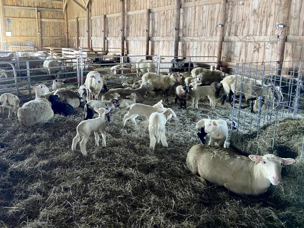 Group pen - After three days, the new mothers and their lambs move to the group pen where the lambs quickly begin to socialize with each other and form play groups. Once the weather warms and the pastures are growing again, usually in April, they will all head out to pasture.