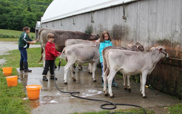 In weekly meetings at the dairy at Shelburne Farms, members learn how to halter, lead, and give their cows a bath. As group leaders, we support and help where needed, but with the motto of “learn by doing”, 4-Hers do almost all of it themselves.