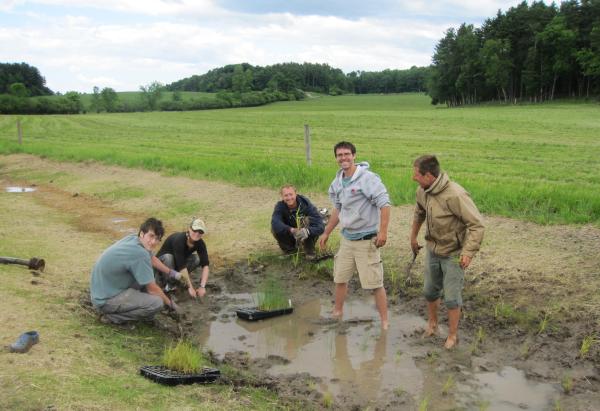 Dana Bishop, the Farm's Natural Resources Assistant Manager (wearing hat), getting some help planting various wetland grasses along the main pedestrian path back in 2012. - Over the years, we’ve participated in several studies and UVM student research projects specifically looking at water quality.