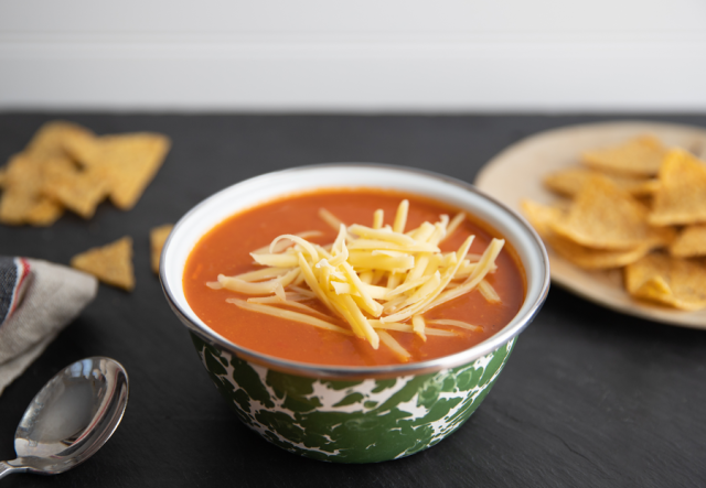A blended soup utilizing those bottom-of-the-bag tortilla chip crumbs that became an instant hit with students and adults.