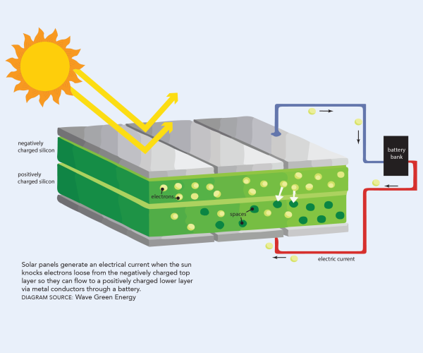 As sunlight – photons – hits the solar panel, some photons interact with the unstable negative top layer, sending a stream of unbonded electrons toward the positive bottom layer. But in between the layers, the mixing of electrons soon creates a diode: an energetic “hill” that only allows electrons to pass in one direction: from the bottom layer up! The top-layer electrons still want to reach the bottom layer, so they flow out a wire circuit, which captures the electron stream and converts it into energy we can use — electricity. (See graph)