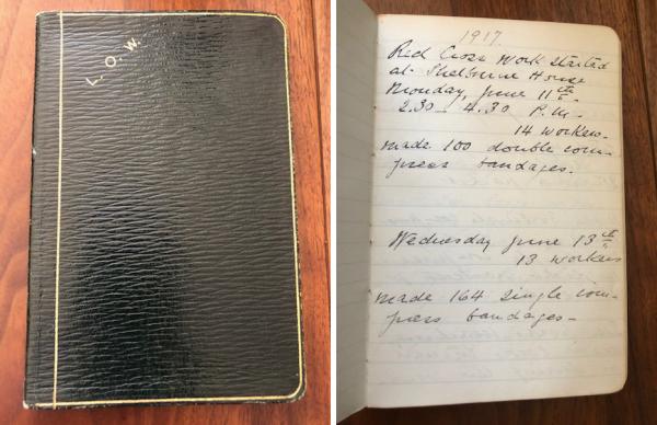 Women gathered year round at Shelburne House through 1919 to support the war effort and local causes. Lila Webb maintained her own small journal at this time, noting in 1918, “Work in surgical dressings, assorted garments & knitted articles, for the American Red Cross, British American War Relief Homeless Children in France, Navy League of the U.S.” They also made garments on request and in haste such as pairs of pajamas “... 7 pairs made by workers from Shelburne Village for Winooski. Hurry call for epidemic patients.” Later, on October 16th, she notes “did 150 influenza masks for Shelburne Red Cross- material supplied by them.”