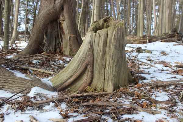 To illustrate his point, Tom points to a living cedar stump. It looks dead, save for a forked, reddish ribbon of bark. (see photo) The stump is no longer generating energy (carbs) through leaf photosynthesis, but it is still receiving and using nutrients from the roots of neighboring trees to grow bark. Over time, its bark will grow over the top, seal off the hole, and remain a living stump.