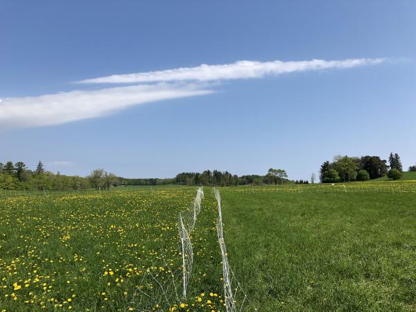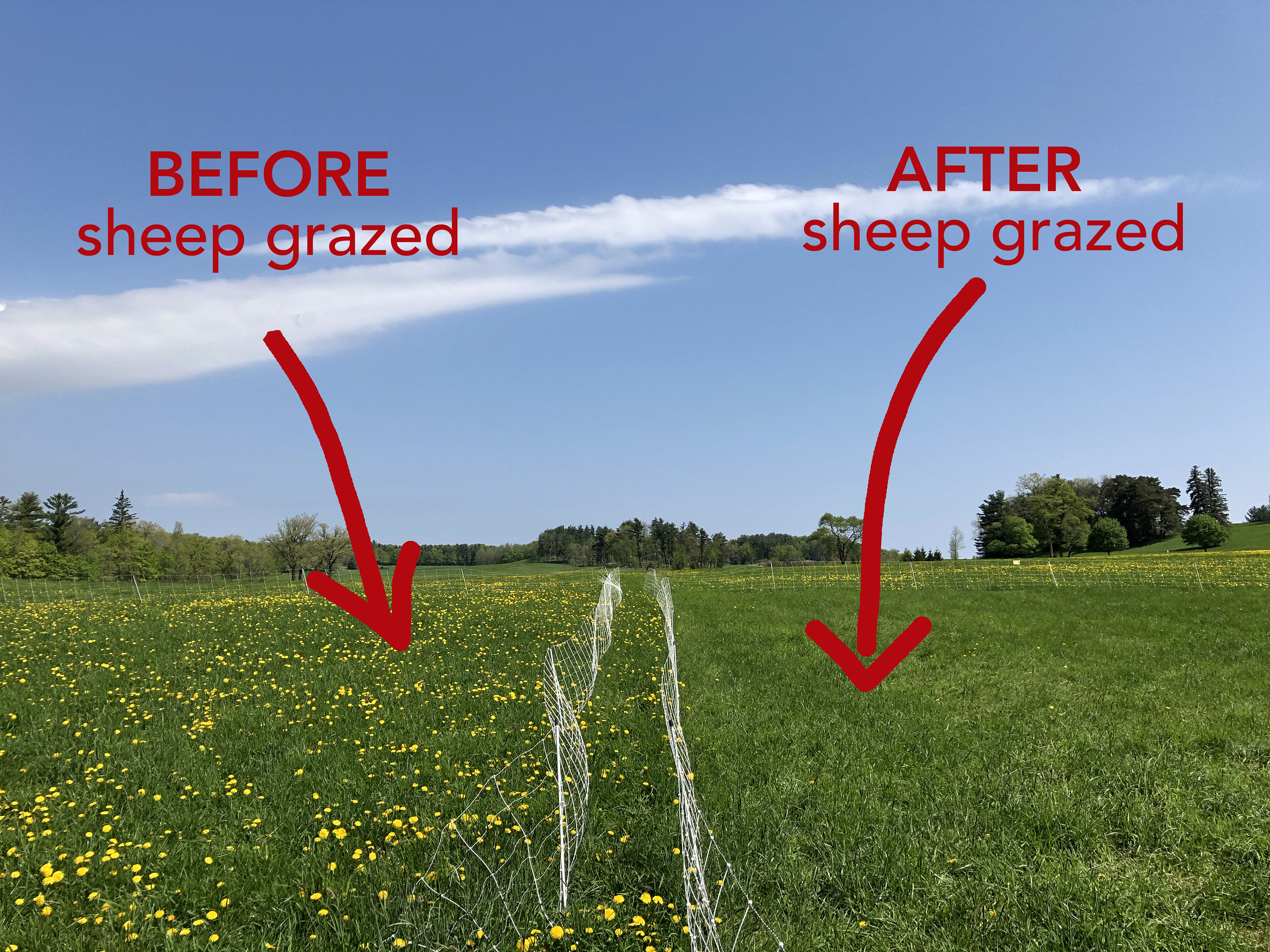 We rotationally graze our sheep, which means the sheep “mob graze” in a small fenced area for a short time, and then we fence them into a new pasture, allowing the grazed plants to grow back. Which pasture below has been grazed by the sheep? The right or the left? CLICK on the photo to find out! (hint: sheep love dandelions!)