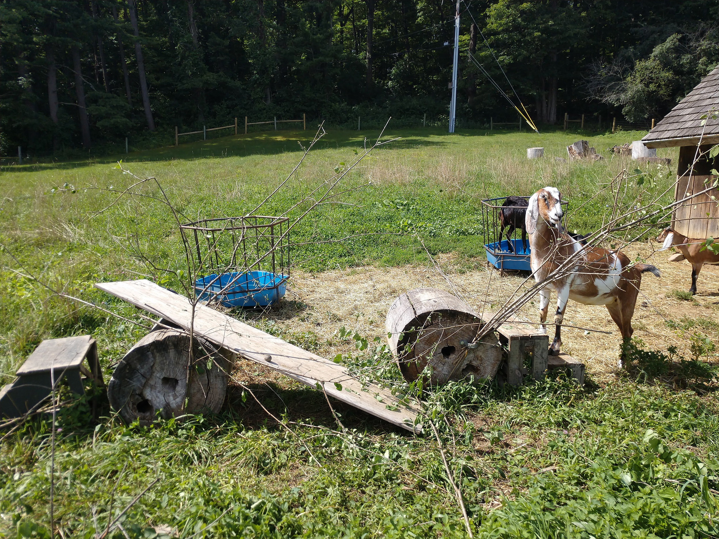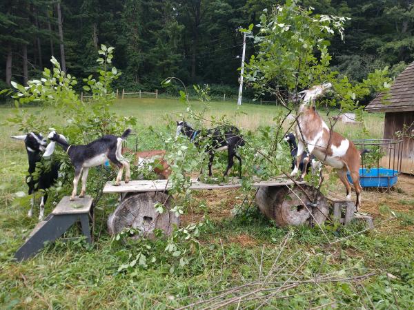 Goats may graze head down in pastures like sheep, but if given the choice, they often prefer to reach for the leaves of trees or shrubs -- heads up! All the adult goats at Shelburne Farms (Zola, Raisin, Yaya, Magpie, and Honeybee) love browsing so much that I added brackets to a simple climbing structure that I'd built for them (goats love to climb, too!). I tuck branches from fallen trees or trimmed bushes into the brackets for the goats to enjoy. CLICK on the photo below to see what the structure looked like after the goats finished munching!