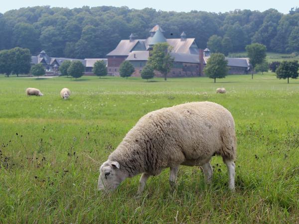 Although our Shelburne Farms sheep and goats are hardy eaters, you still shouldn't try to feed them yourself. That's best left to the farmers, who know how to manage their diets and health.