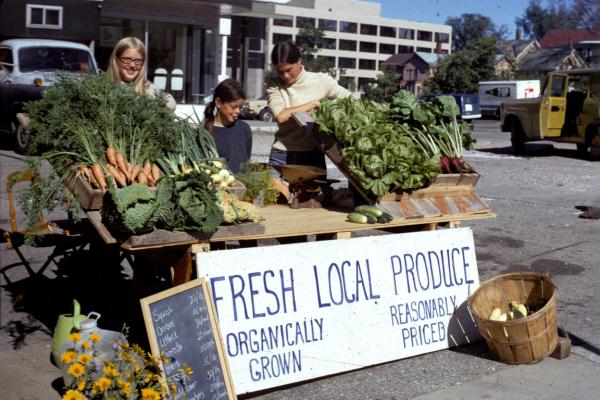 Burlington Farmers Market, 1973Early board of trustees minutes note that Shelburne Farms was participating in Farmers Markets as early as 1972 and growing potatoes, pumpkins, sunflowers, corn, strawberries, asparagus, and blueberries. Two years later, board minutes from 1974 note “Shelburne Farms Resources will run a summer camp and grow a two to three-acre garden with the intention of selling vegetables to raise revenue.”