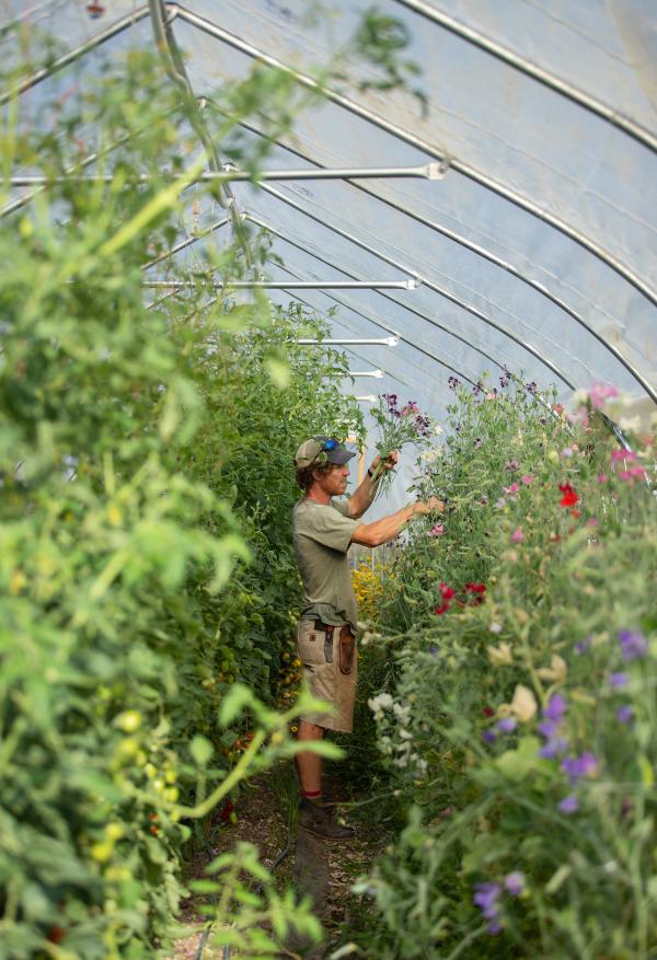Market Gardener Josh Carter harvesting flowers in one of the hoop houses this summer. (Photo: Sarah Webb))Today, the seven-acre certified organic Market Garden site has six greenhouse structures. Five hoop houses, totaling 8,440 square feet, help extend the growing season in the early spring and late fall and support crops that prefer a tunnel environment, like cut flowers and trellised tomatoes. The tunnels are also a key tool to help mitigate the risk of climate change. There is also one greenhouse with heat and electricity for seeding and growing transplants in the early spring. Josh Carter said “This year we seeded carrots in mid-March and transplanted tomatoes about the third week in April.” Our organic growing practices focus on sustaining healthy, fertile soil. Annually, 1.5 acres support perennial fruit, herbs, and flowers, 2.5 acres are actively cultivated, and the remaining 2.5 acres are rested and grow cover crops to improve the soil.