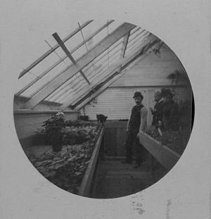 Lila and Seward Webb were very involved in the selection of plant specimens for propagation, experimentation and cultivation. Here they tour the greenhouse with head of the operation, Alexander Graham, ca. 1890sThe current Market Garden site was originally home to garden plots and a range of glass and iron framed, steam-heated greenhouses erected between the late nineteenth and early twentieth centuries. This operation grew extensively—and synchronously—with the expansion and growth of Shelburne Farms. Palms, ferns, carnations, violets, grapes, roses, and mushrooms were exclusively grown in their own individual greenhouses where humidity, light and heat could be regulated. These glasshouses allowed a team of gardeners to cultivate exotic flowers such as gardenias, calla lilies, lilies of the valley, roses, and chrysanthemums year round. Flowering and ornamental plants were cultivated for the house’s formal gardens and interiors, special occasions, and for the Shelburne Episcopal church. Fruit and vegetables like strawberries, artichokes and asparagus were also grown for family, friends, and employees. By 1906 the square footage of the greenhouse building complex was 24,683’ or roughly half the size of a football field. Extensive greenhouse and agricultural operations allowed a country estate to run almost as a self-sufficient, sustaining entity.