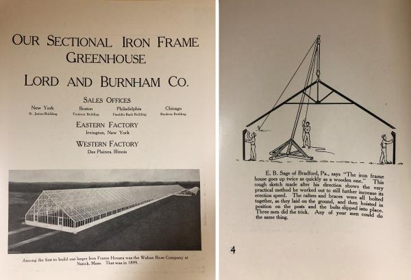 A Lord & Burnham iron frame greenhouse could be handily and easily erected with just three people. (Shelburne Farms Collections).Greenhouses were a common feature for country estate properties of the period. Innovations in design and construction created great flexibility and longer lasting structures that appealed to a growing clientele. Prefabricated iron framing and large plate glass, shipped by railcar and assembled on site, coupled with advances in heating and ventilation technology, provided state-of-the-art options for private and public glasshouse construction. The use of rot-resistant cypress wood for interior benches and platforms was also popular. The New York Botanical Garden is a public example of Lord & Burnham’s work and these developments.