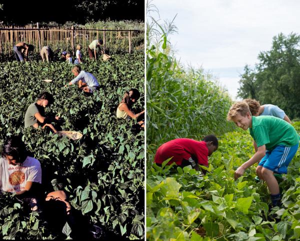Summer campers at the Market in the 1970s (left) and in 2018 (right). (Shelburne Farms Archives and Sarah Webb)As a fledgling nonprofit in 1972, Shelburne Farms began two new initiatives: offering its first summer camps on the land in and around the Market Garden, and growing produce again to sell to local farmer’s markets. Both programs continue to this day!