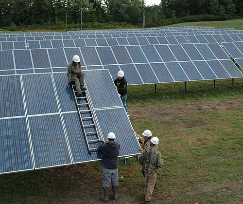 In 2010, in partnership with Green Mountain Power, we erected a "solar orchard" in a fallow field behind the Coach Barn. These 530 photovoltaic panels generate about 180,000 kilowatt hours of energy annually — enough for 25 houses. All the power generated feeds into the GMP grid. We also constructed one solar tracker. The Farm is committed to seeking renewable energy strategies like wind, solar, and building efficiency throughout the property.