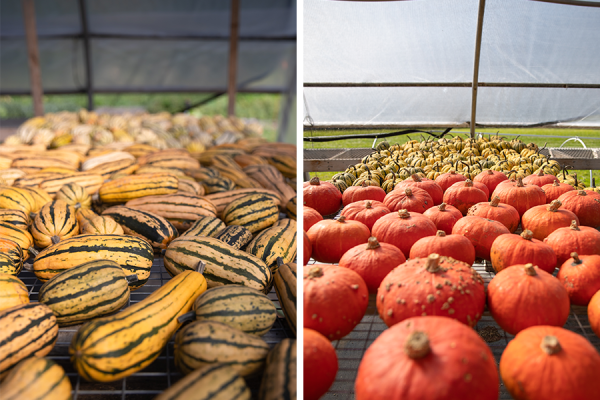 The Market Garden has made moves to extend the growing season, but there is no mistaking that we’re past peak harvest, and we’re working our way into late-season crops like winter squashes. Unlike their thinner-skinned summer counterparts, winter squash are cured to set the skin to lengthen storage life. “Curing also concentrates the sugars by letting some water exit the squash’s flesh through respiration,” explains Market Garden Manager Josh Carter. “We cure our winter squashes in the greenhouse on tables for 10-14 days before moving them into storage.”