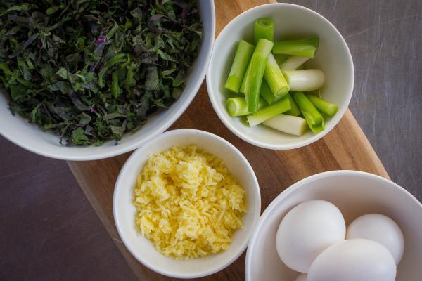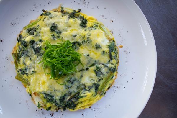 Luckily for us, Chef Jim McCarthy is sharing a quick and painless recipe to utilize those hearty greens at the breakfast table — a Kale and Scallion Frittata. A frittata is a perfect food for one or for a group: it’s like the more easy-going cousin of an omelet. While omelets require a careful fold and just the right amount of filling, frittatas ask for much less finesse: mix all the sauteéd vegetables in the pan, add the eggs and cheese, and finish it off under the broiler. After it has cooled, slip it from the pan and slice it up like a breakfast pie. But don't limit this dish to a hot breakfast — frittatas good room temperature for picnicing, or even cold from the fridge as a midnight snack. So chop up handfuls of abundant kale (or spinach) to toss into the pan; it will wilt quickly and you can pack a lot more into your skillet than you think!
