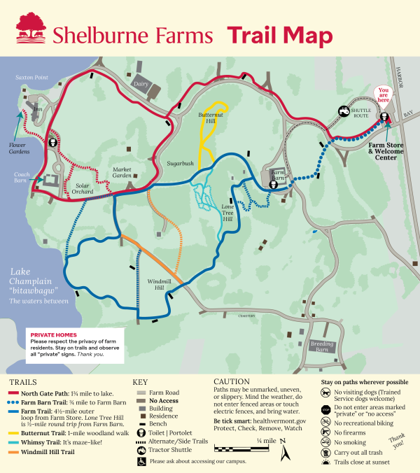 Our more than 10 miles of walking trails offer breathtaking views and quiet spaces for conversation, discovery, and reflection. They are the primary way to enjoy our extensive campus, including popular destinations to the Farm Barn, lakeshore, Lone Tree Hill, and Flower Gardens.
