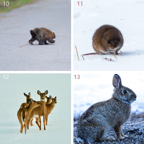 10. Porcupine | 11. Vole | 12. Deer | 13. Rabbit (all Craig Newman)