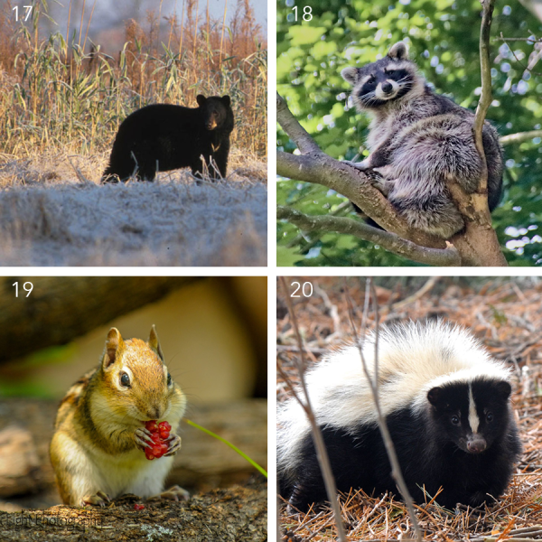 17. Black Bear (Vermont Fish & Wildlife) | 18. Raccoon (dusan veverkolog) | 19. Chipmuck (Craig Newman) | 10. Skunk (crAig Newman)