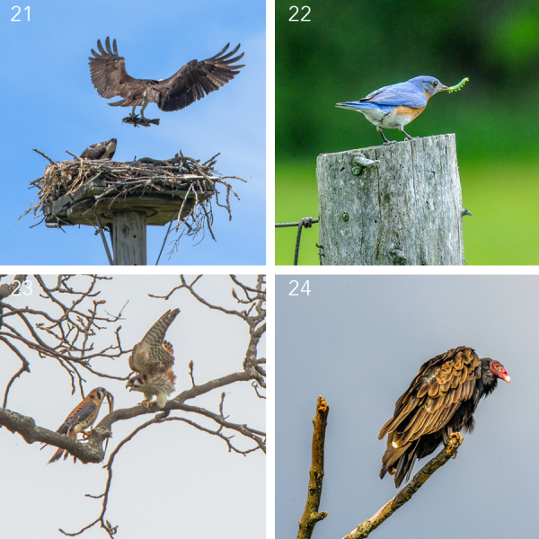 21. Osprey with a fish | 22. Bluebird with insect | 23. Kestrel with a snake | 24. Vulture (All Craig Newman)